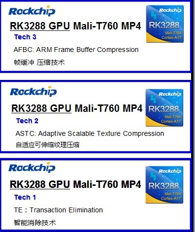 RK3288 adopts a Mali-T764 GPU. Compare to last generation, this GPU’s performance has been improved about 500 percent. Several memory compression techniques such as AFBC, ASTC, and TE have been introduced, and brought the GPU more power. On the premise of improving this GPU’s performance, this GPU’s power consumption are reduced apparently.