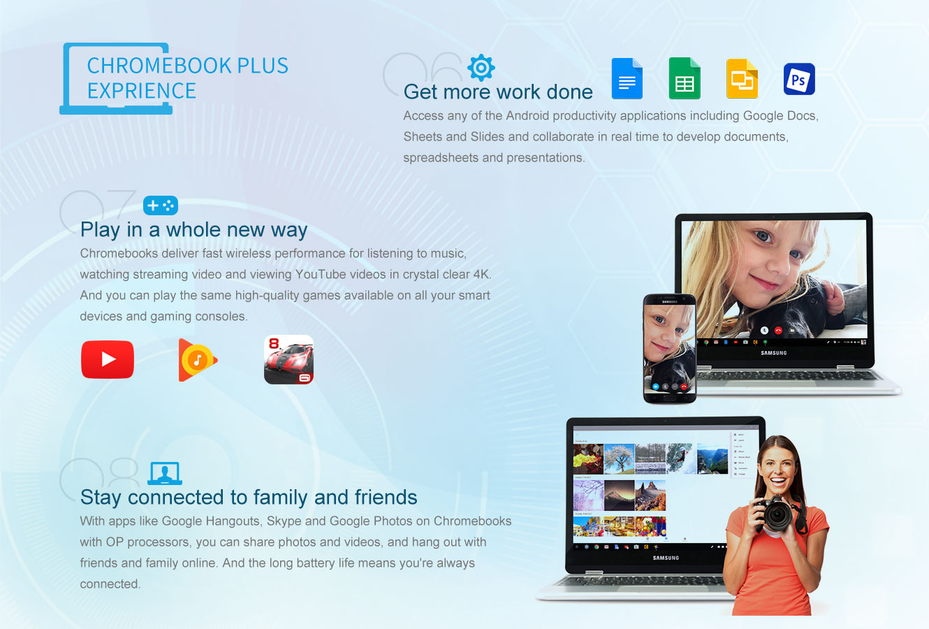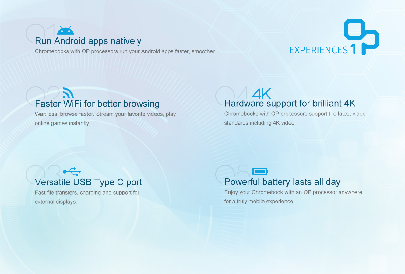 Open up new possibilities of Chromebook with OP1. OP1 powered Chromebook allow Android apps to run natively, achieve fast wireless connectivity, long battery life and overall high performance. OP1 is designed to provide you a brand new experience for Chromebook.